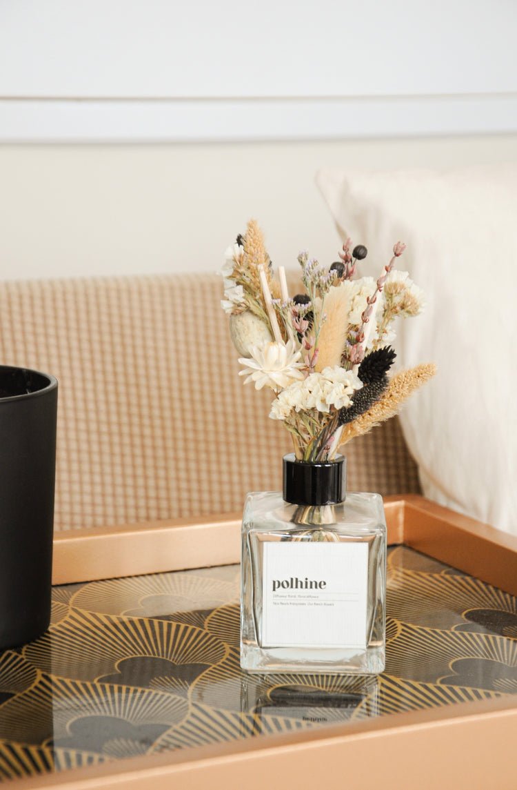 Pour parfumer votre diffuseur de fleurs séchées Polhine, il vous suffira de simplement verser votre parfum dans le contenant déjà fleuri avec ses bâtons.