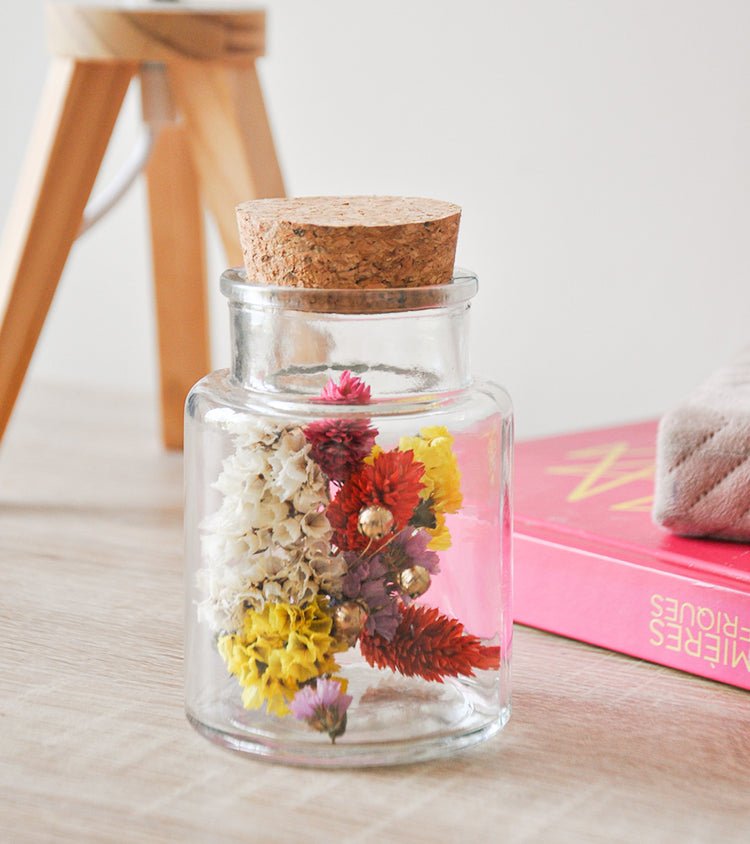 Ces flacons bouteilles renferment des fleurs séchées, dans un grand nombre de couleurs de compositions florales. Des fleurs séchées, issues de l'agriculture française, et conservées sous verre pour une touche fleurie sans contrainte d'entretien !