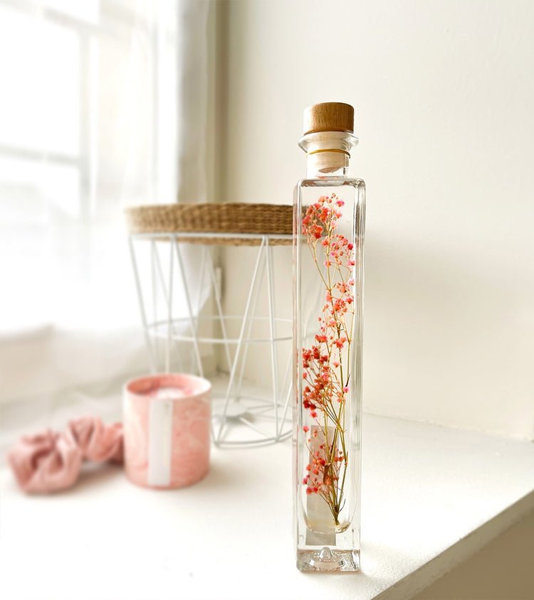 Nos herbiers floraux en flacon se composent de fleurs séchées sans colorant immergées dans une huile non toxique, qui leur donne alors une brillance et une pérennité sans équivalence.