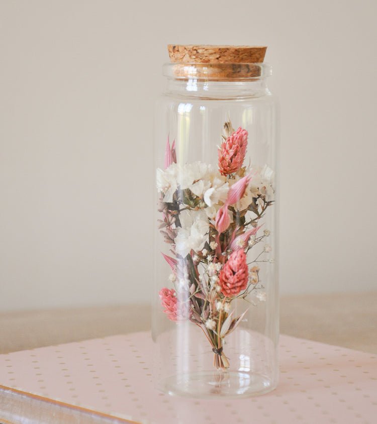 Ces flacons en verre et bouchon de liège referment des petits bouquets délicats et poétiques de fleurs séchées : bleu, blanc, rose poudré, jaune, et bien d'autres !